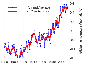 August 2014 was the hottest August ever recorded (global average temperature of 61.45°F), with records dating back to 1880. Rising global temperatures have been accompanied by changes in weather and climate. Many places have seen changes in rainfall, resulting in more floods, droughts, or intense rain, as well as more frequent and severe heat waves. The planet’s oceans and glaciers have also experienced some big changes – oceans are warming and becoming more acidic, ice caps are melting, and sea levels are rising. As these and other changes become more pronounced in the coming decades, they will likely present challenges to our society and our environment. [U.S. Environmental Protection Agency]