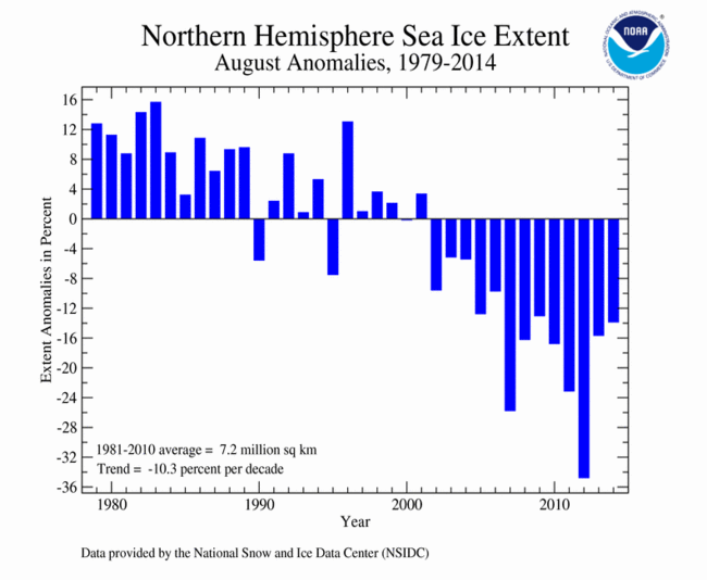 The Northern Hemisphere (Arctic) sea ice extent — which is measured from passive microwave instruments onboard NOAA satellites — averaged for August 2014 was 6.22 million square km (2.40 million square miles), 1.00 million square km (390,000 square miles), or 13.85 percent, below the 1981-2010 average. This was the seventh smallest August Arctic sea ice extent on record.